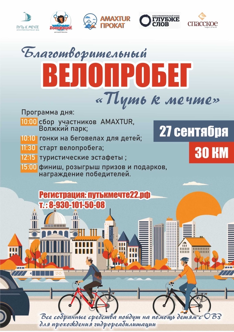 Друзья! Предлагаем принять участие в благотворительном велопробеге «Путь к мечте», который пройдёт 27 сентября, в ДЕНЬ ТУРИЗМА!